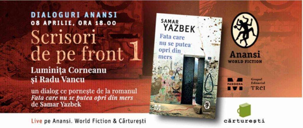 „Scrisori de pe front 1”, cel dintâi eveniment din această serie, plănuit pentru data 8 aprilie, începând cu ora 18.00, online, pe paginile de Facebook #Anansi și #Cărturești, are ca punct de plecare romanul Fata care nu se putea opri din mers al scriitoarei siriene Samar Yazbek (traducere de Laura Sitaru). Despre felul în care evenimentele recente din războiul sirian pot da naștere unui proiect ficțional descris de la L’Express drept „un roman atins de har” vor vorbi doi intelectuali apreciați, cunoscuți în egală măsură și pentru preocupările lor civice susținute: scriitoarea și criticul literar Luminița Corneanu, alături de poetul, prozatorul și eseistul Radu Vancu.