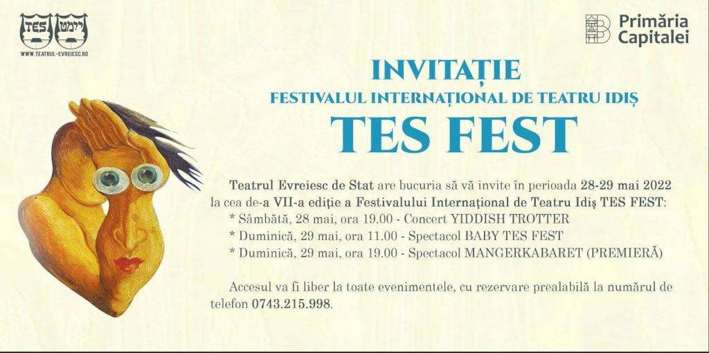 Teatrul Evreiesc de Stat anunță oficial că organizează în perioada 27-29 mai 2022 cea de-a VII-a ediție a Festivalului Internațional de Teatru Idiș TES FEST. Așadar, în cele trei zile de festival vor fi prezentate în premieră, pe scena TES, evenimente realizate în colaborare cu artiști internaționali, reprezentanți ai limbii și culturii idiș.