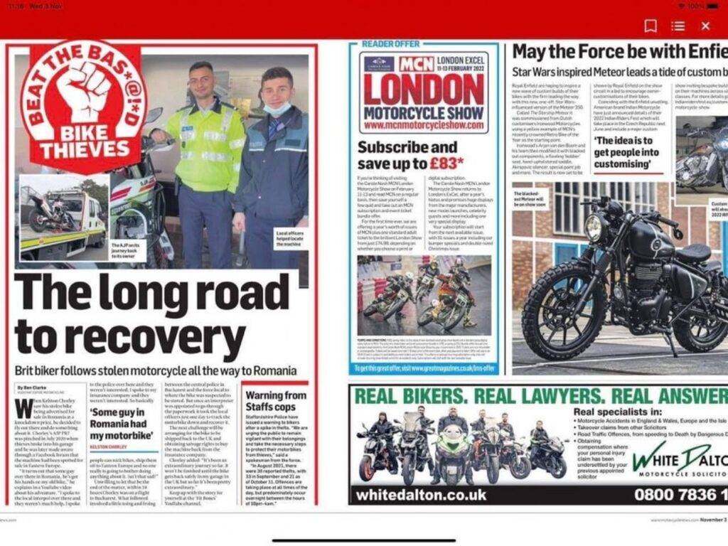 Conform polițiștilor gălățeni, într-un articol apărut într-o publicaţie din Marea Britanie, din data de 3 noiembrie, este scoasă în evidență povestea unui bărbat din UK care a reuşit, cu ajutorul poliţiştilor din comuna Matca, să-şi recupereze motocicleta furată. El a rămas fără bunul personal în anul 2020, atunci când motocicleta sa a fost furată din garajul locuinţei sale, din Anglia.