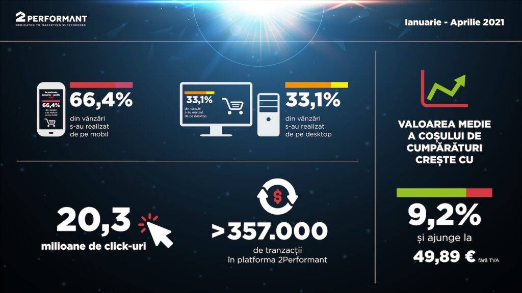 Compania de tehnologie 2Performant, liderul pieței de marketing afiliat din România, listată pe piața AeRO a BVB (simbol bursier 2P), observă o păstrare a trendului de cumpărare preponderent online, tendință puternic accelerată de pandemie, cu o preferință pentru cumpărăturile realizate de pe mobil, dar și o creștere a valorii coșului de cumpărături. Conform datelor disponibile în platforma de marketing afiliat 2Performant.com, în perioada ianuarie – aprilie 2021, 66,4% din vânzări s-au realizat de pe mobil, în vreme ce 33,1% de pe desktop. Totodată, românii cheltuie cu 9,2% mai mult pentru un coș de cumpărături în magazinele online, față de aceeași perioadă a anului trecut.
