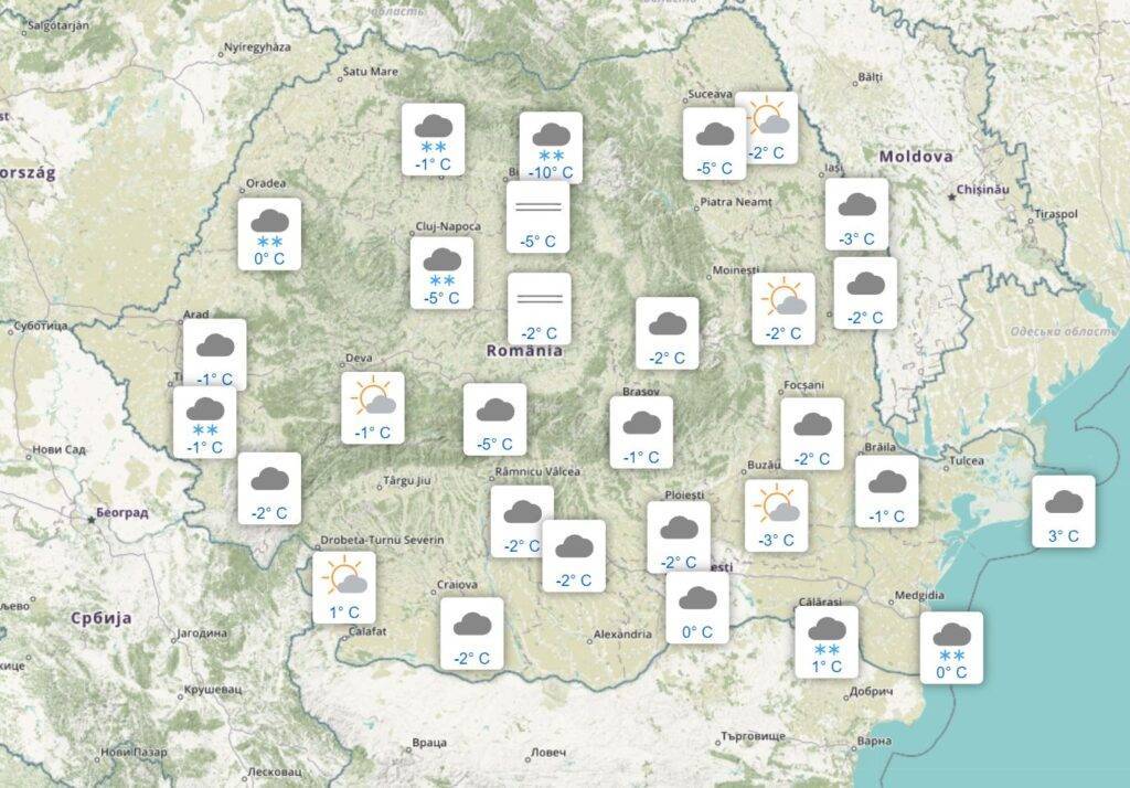 În Transilvania, vremea va fi puțin mai plăcută, însă ninsorile vor fi prezente în teritoriu. Cerul va fi mai mult noros, iar vântul va sufla moderat, cu intensificări pe crestele munților. Termometrele vor înregistra temperaturi cuprinse între -1 și 4 grade Celsius.