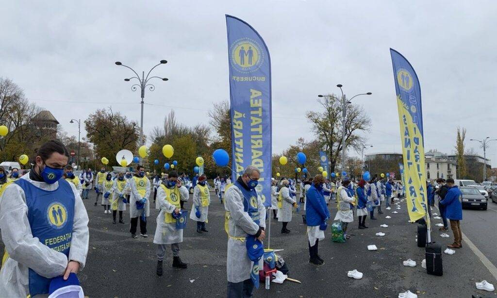 Sindicatul „Solidaritatea sanitară” protestează, pe parcursul zilei de astăzi, în Piaţa Victoriei, la Palatul Cotroceni şi la Palatul Parlamentului. Oamenii au organizat protest pentru acordarea drepturilor salariale. Mai mult, în paralel, vor avea loc manifestări de susţinere în spitalele din ţară, acolo unde angajații vor ieși în curțile instituțiilor și își vor cere și ei drepturile.